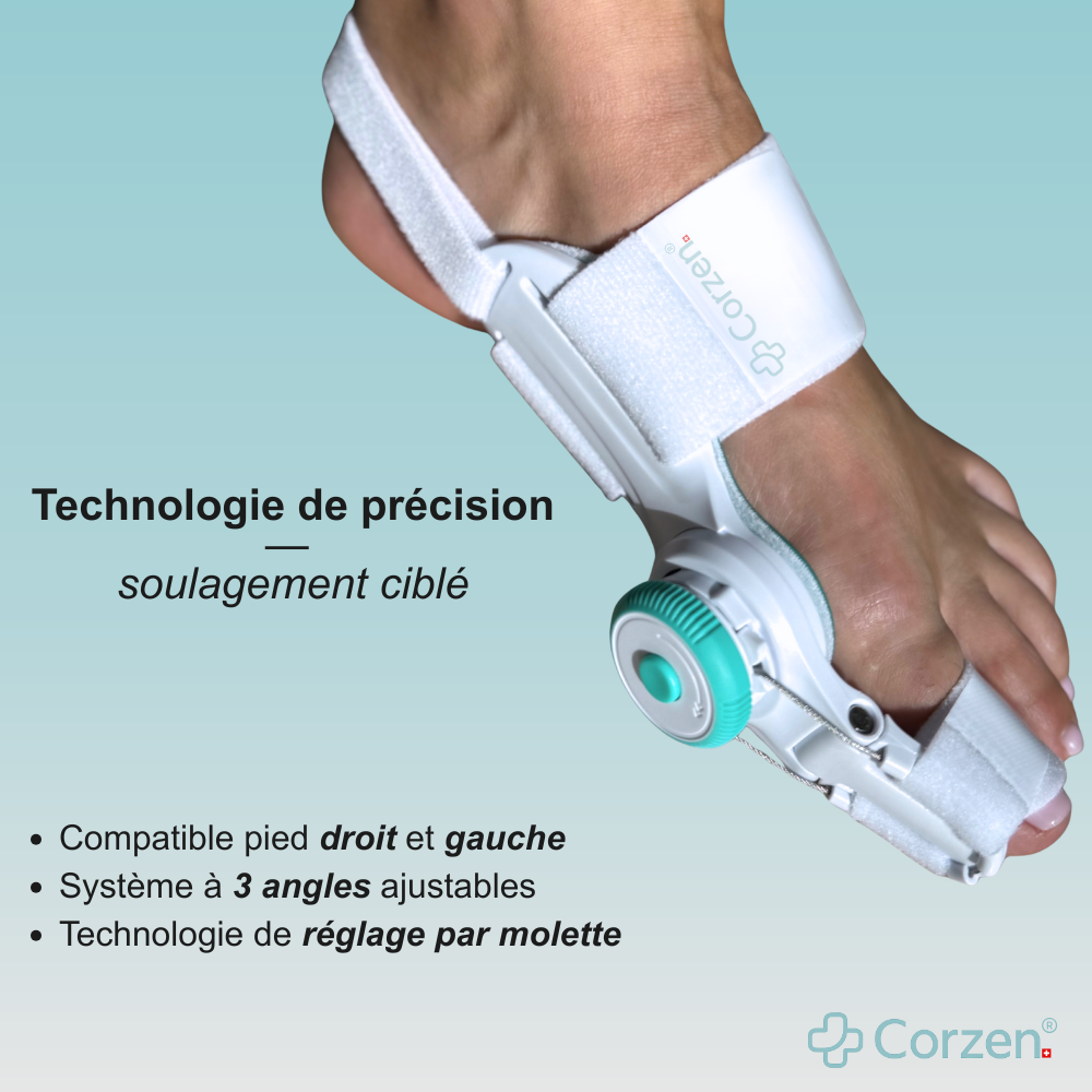 Conçue pour soulager l’hallux valgus (oignons), cette orthèse s’adapte aussi bien au pied gauche qu’au pied droit. Son système à 3 angles ajustables corrige progressivement l’alignement du gros orteil, réduit la pression et apaise l’inflammation. Discrète et confortable, elle vous aide à retrouver une marche naturelle — sans douleur.